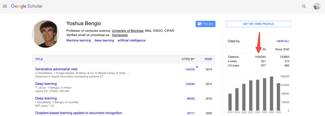 Yoshua Bengio 成为谷歌学术上首个论文援用量跨越 100 万的人!为科学取手艺冲破供给。